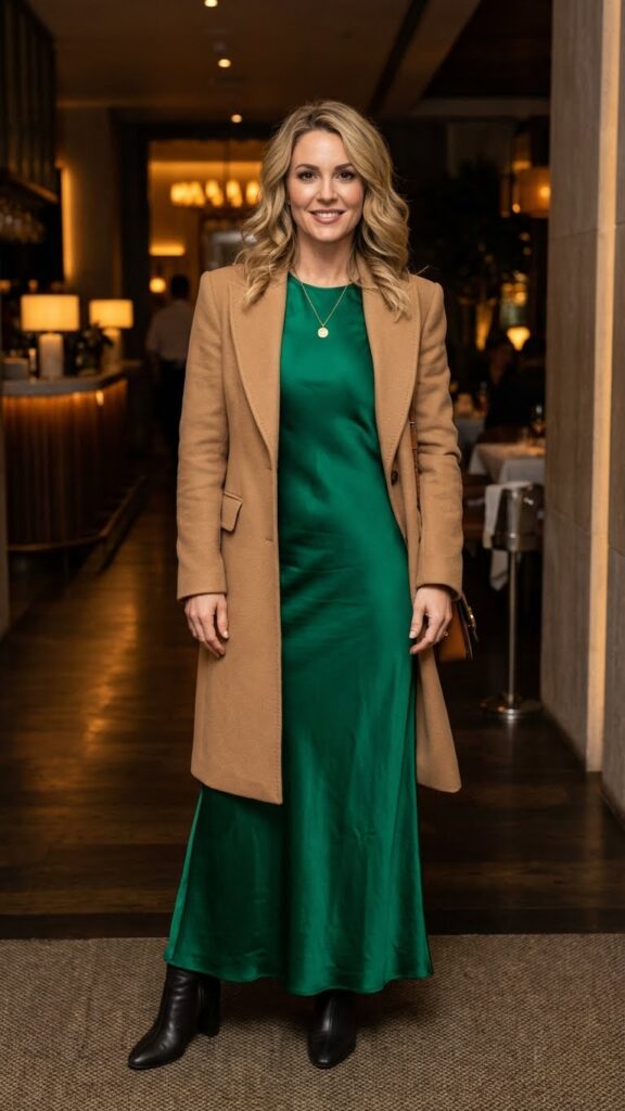 Choose a maxi dress in rich jewel tones like emerald or burgundy for maximum visual impact. Layer a customized, tailored, or fitted wool or cashmere coat over your dress to add sophistication and warmth through cozy textures.