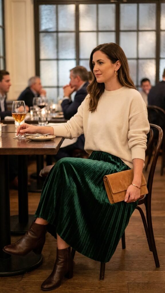 A velvet midi skirt paired with a cashmere sweater creates an effortlessly graceful look that’s perfect for chilly dinner dates. You’ll love how this combination lets you move freely while looking polished and put-together.