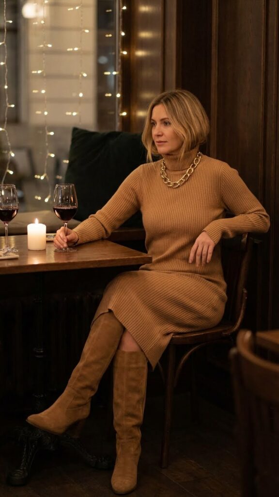 When you’re craving effortless elegance for your winter dinner date, a monochromatic knit dress paired with knee-high boots delivers stunning results. This combination creates a sleek, elongated silhouette that flatters every body type while keeping you warm throughout the evening.
