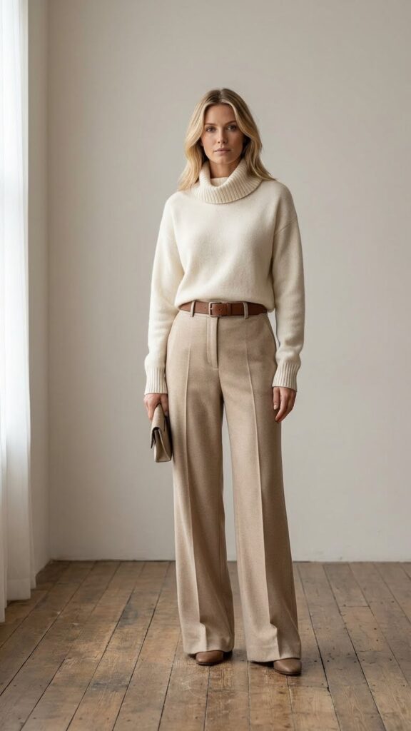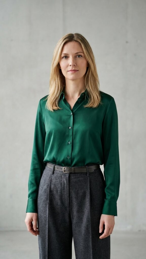 Pairing luxurious silk with structured wool creates beautiful texture contrast. The silk adds softness and subtle sheen, while high-waisted wool pants provide warmth and a flattering fit. Choose jewel tones like emerald or burgundy for your blouse to complement neutral wool pants. Elegant winter date night outfits blend polish and warmth for a chic look.