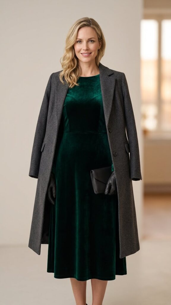 When you’re ready to step up the glamour factor from cozy knitwear, a velvet midi dress paired with a structured coat creates instant drama. Velvet textures catch light beautifully, giving you that luxurious appearance without feeling overdone. Choose rich jewel tones like emerald, burgundy, or sapphire for maximum impact.