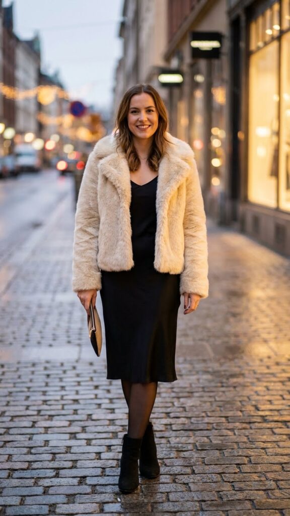 Few outfit combinations capture winter romance quite like a luxurious faux fur jacket draped over a timeless little black dress. This pairing gives you the freedom to move between venues without sacrificing style or warmth.