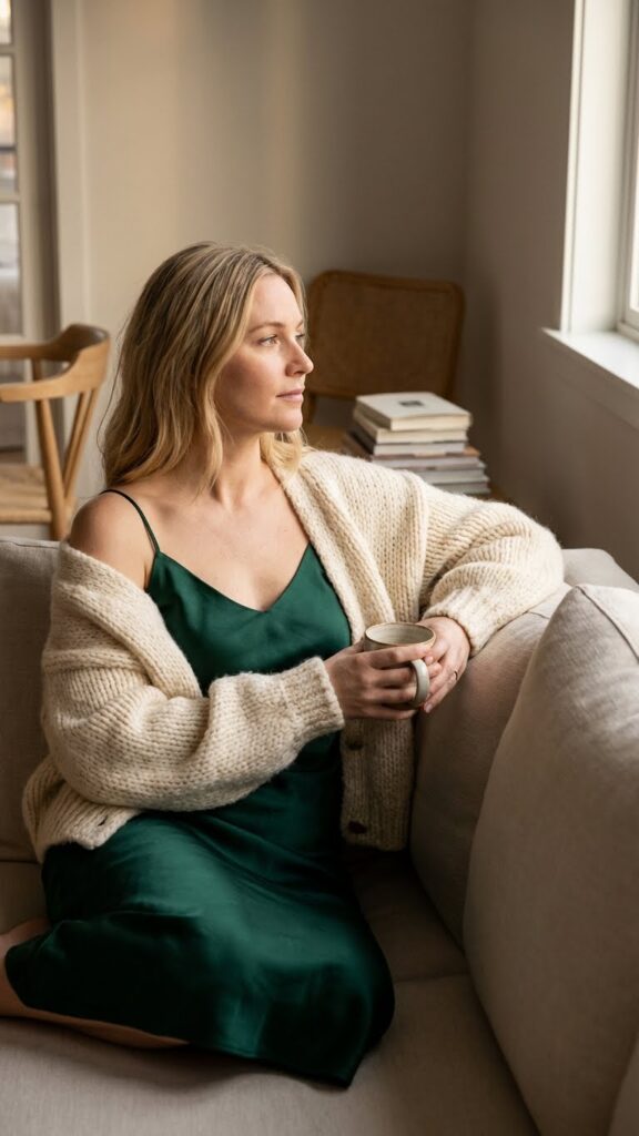 Choose a midi-length slip dress in jewel tones like emerald, burgundy, or navy for maximum sophistication. Drape an oversized cardigan over your shoulders or wear it open to showcase the dress’s silhouette.