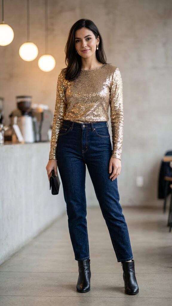 Don’t overthink accessories—let the sequins do the talking. A simple clutch and delicate jewelry complete this glamorous yet relaxed winter date night look.