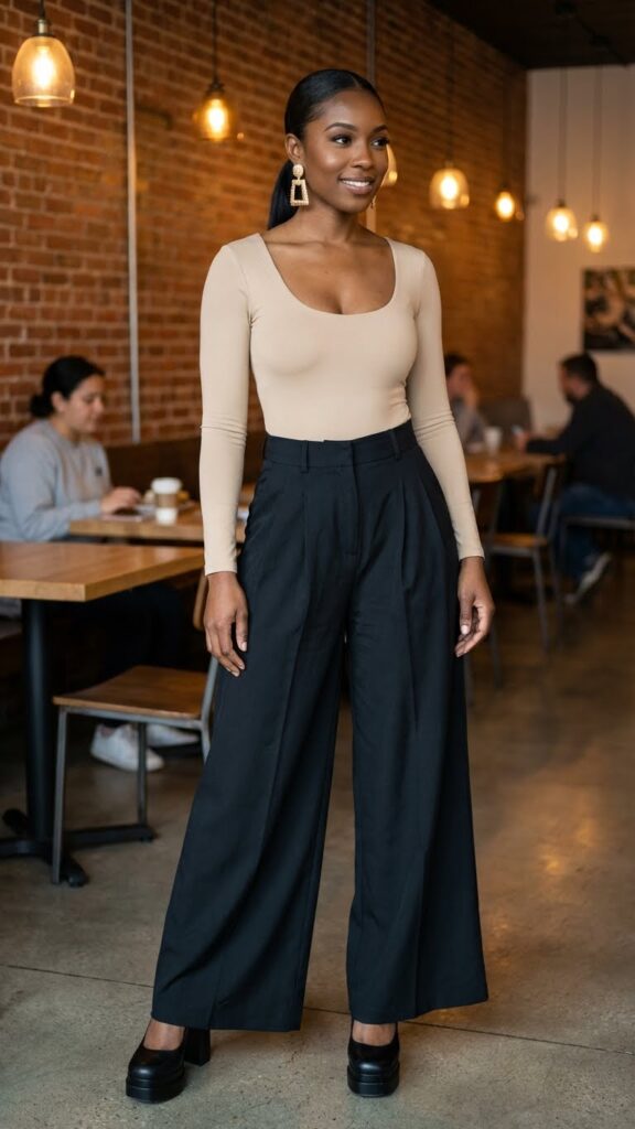 Wide leg pants are having a moment, and honestly, it’s about time. They’re chic, they’re comfortable, and they make you look taller. Pair them with a fitted bodysuit to balance the volume, and you’ve got proportions that work beautifully. Go for high-waisted pants to really elongate your legs.