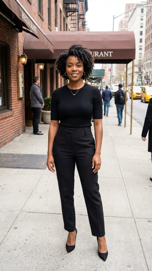 Keep accessories bold since black is the perfect backdrop. Think statement earrings, a pop of color in your shoes, or a bright lip. Texture also matters here. Velvet, satin, or lace adds dimension and keeps the look from falling flat.
