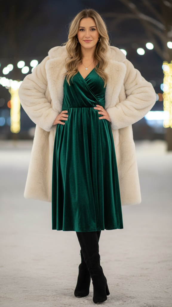 Nothing captures winter elegance quite like a velvet midi dress paired with knee-high boots and a luxurious faux fur coat. You’ll find various midi dress styles work beautifully for romantic dinners, from wrap designs to A-line silhouettes. Choose rich jewel tones like emerald, burgundy, or sapphire to complement the season’s mood.