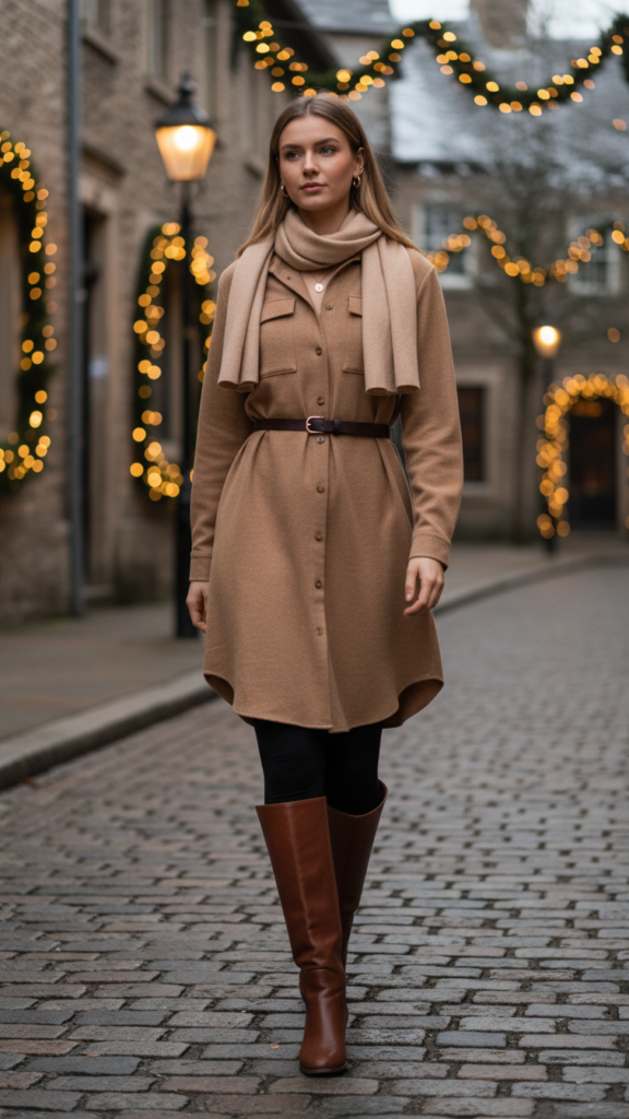 Pair your shirt dress with thick leggings for added warmth and comfort during chilly nights. Choose fleece-lined or wool-blend options that won’t sacrifice style for practicality. Your riding boots will complete the look while protecting you from winter weather.