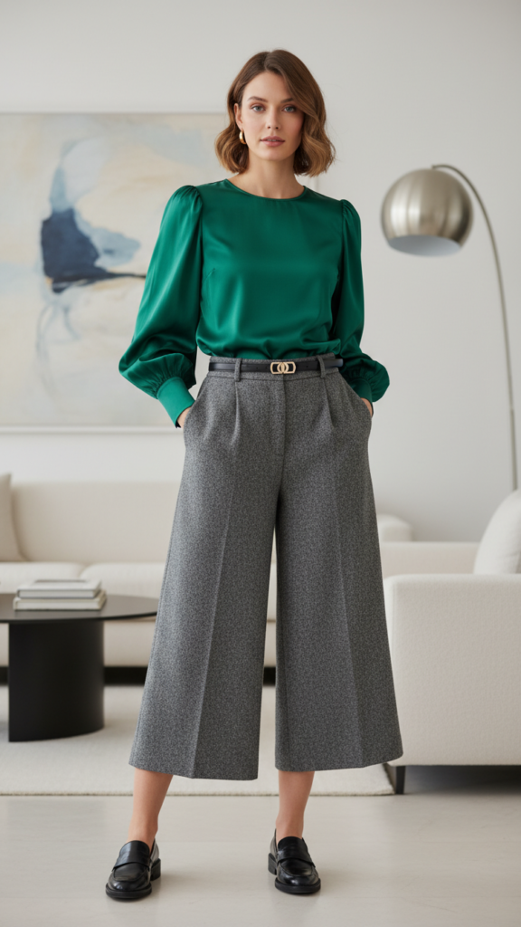 Choose a silk or satin puff-sleeve blouse in jewel tones like emerald or burgundy. The dramatic sleeves add visual interest while the cozy textures of wool culottes keep you warm throughout the evening. Tuck your blouse into high-waisted culottes that hit mid-calf for the most flattering proportions.