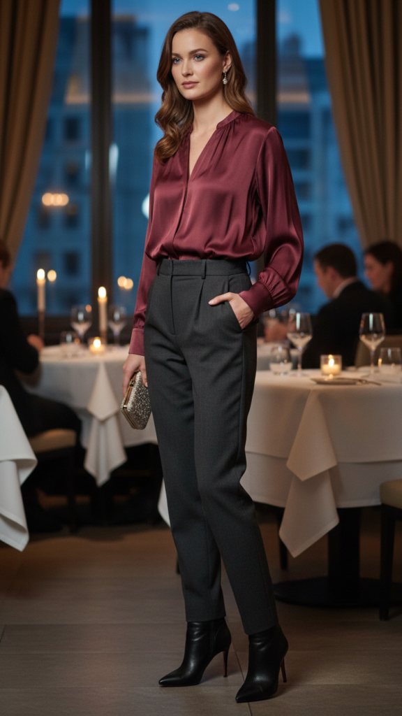 When you’re seeking timeless elegance for your winter dinner date, a silk blouse tucked into high-waisted trousers creates an effortlessly polished silhouette. The flowing fabric of silk contrasts beautifully with structured trousers, giving you sophisticated movement with every step. Balanced dressy looks are the goal for this elegant winter dinner outfit. Choose jewel-toned blouses like emerald or burgundy to complement winter’s rich color palette.