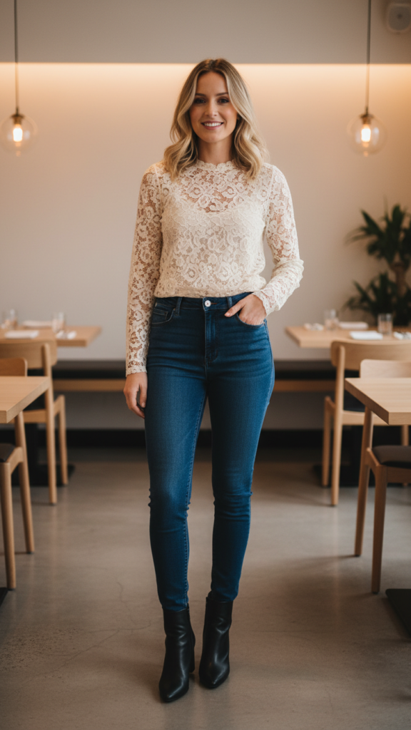 Lace Top With Dark Jeans and Heeled Booties