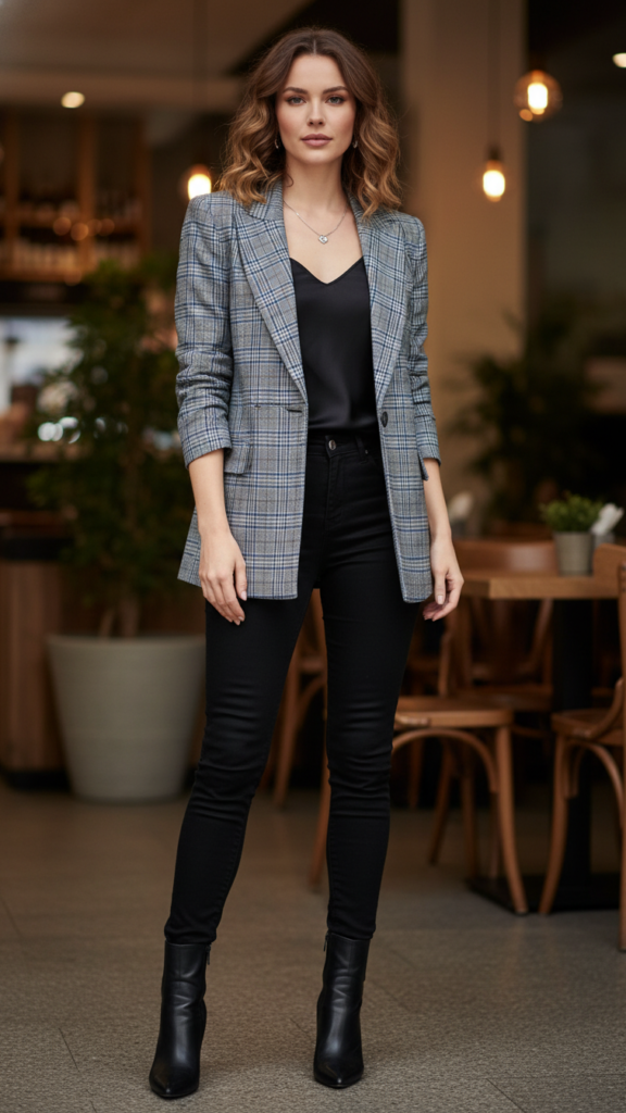 Black skinny jeans provide the perfect foundation, elongating your legs and creating a sleek silhouette. This combination offers cozy layering options – you can easily adjust your comfort level throughout the evening. Choose pointed-toe ankle boots or heeled mules to complete the look. Add delicate jewelry and a clutch purse for finishing touches. The blazer’s versatility means you’re dressed appropriately for upscale restaurants or casual bistros, giving you freedom to choose any venue.