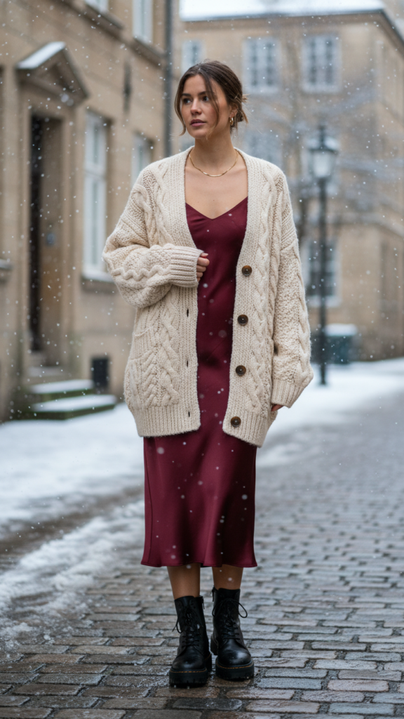 Knit Cardigan With Slip Dress and Combat Boots