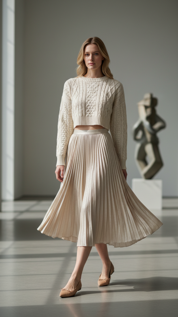 By pairing a cropped sweater with a pleated midi skirt, you’ll create an outfit that strikes the perfect balance between cozy and sophisticated. The cropped length shows just a hint of waist, while the midi skirt provides elegant coverage for winter temperatures. You can add cozy layers like a cashmere wrap or structured blazer when moving from outdoors to inside.