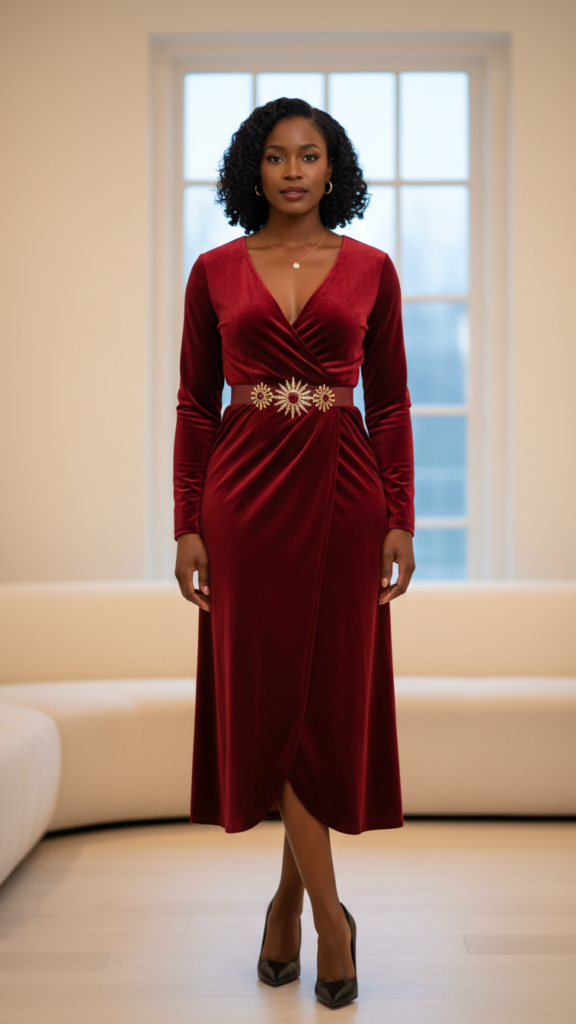 Ruby red wrap dresses command attention while flattering every curve, making them perfect for winter dinner occasions when you want to feel confident and polished. The wrap silhouette naturally cinches your waist while the rich color brightens cold winter evenings effortlessly.