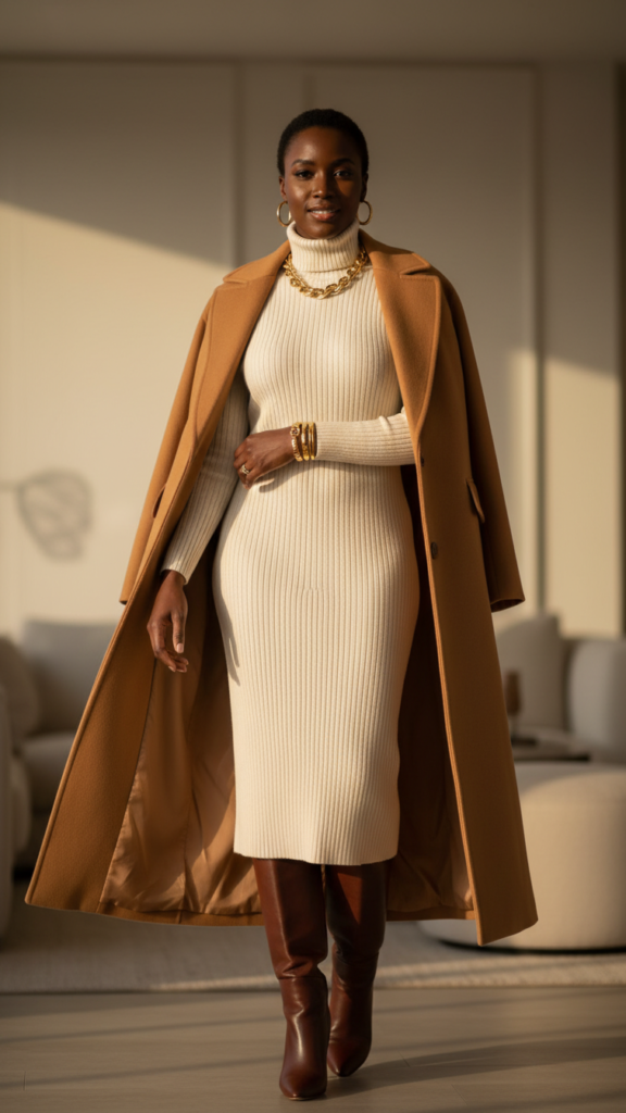 Choose a fitted or A-line knit dress that hits at or below your knees for perfect proportion. Add texture with ribbed or cable-knit patterns that remain cozy yet chic. Complete your look with knee-high boots in black or brown leather, and accessorize with gold jewelry that complements both the camel and your complexion. This combination offers movement flexibility while ensuring you’re appropriately dressed for upscale restaurants or intimate dinner parties.