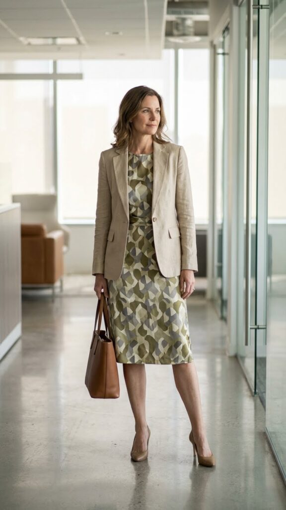 When you’re ready to make a statement while maintaining professionalism, printed dresses paired with neutral outerwear create the perfect balance between personality and polish. Choose floral, geometric, or abstract prints in subdued colors for maximum versatility.