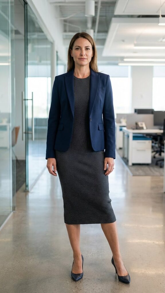 Combining the comfort of a knit dress with the authority of a structured jacket creates an unbeatable office combination that balances professionalism with all-day wearability. You’ll move freely while maintaining sharp presentation standards that command respect in meetings and daily interactions.