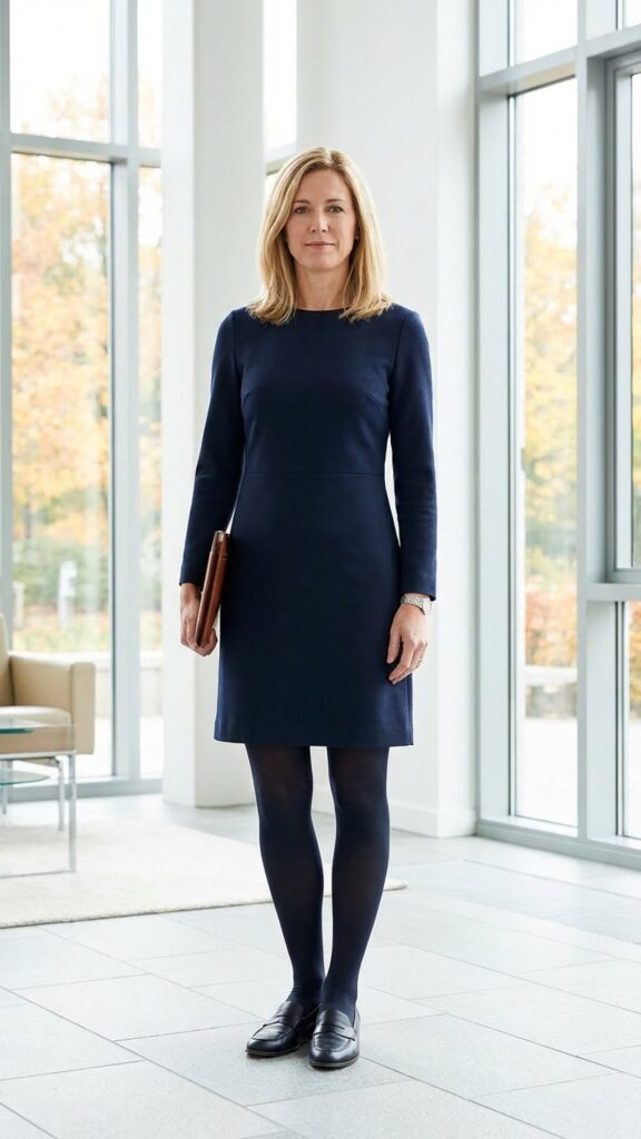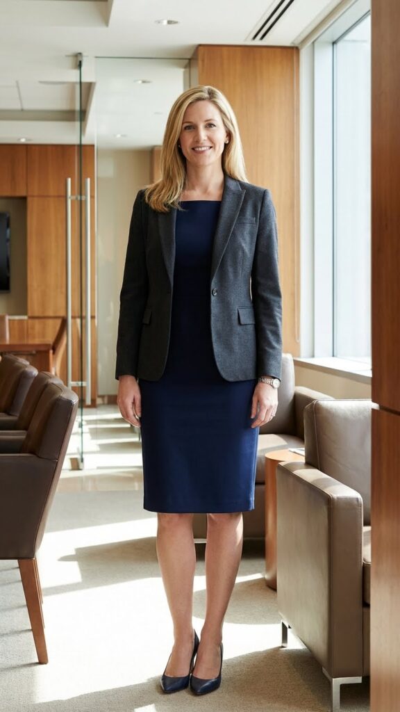Choose a well-fitted sheath in navy, black, or charcoal for maximum versatility. Add a coordinating blazer in complementary colors like cream or soft gray. The structured silhouette flatters most body types while projecting confidence and competence. This stylish business attire combination ensures you’ll always look polished and appropriate for corporate workplace environments. You can easily shift this outfit from boardroom to business dinner.