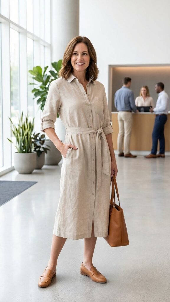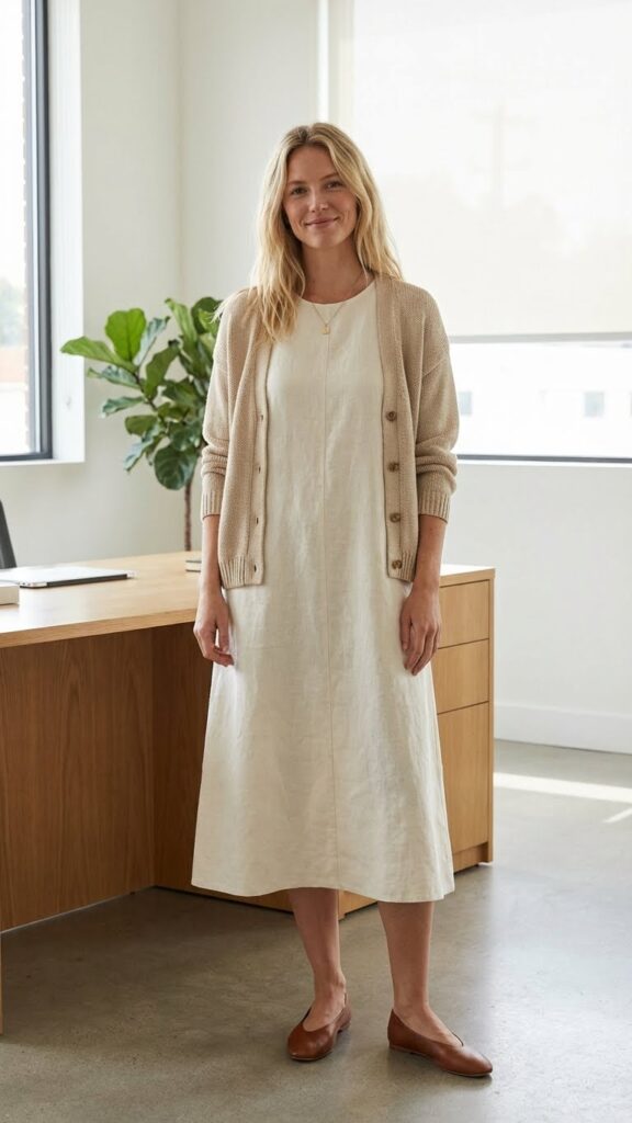 Layer with a cardigan for air-conditioned offices, and accessorize with a structured handbag and delicate jewelry. This combination creates an effortlessly sophisticated look that shifts smoothly from meetings to after-work events.