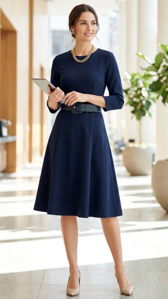 The belted waistline works exceptionally well with A-line and shift dresses, altering loose-fitting styles into customized statements. Position your belt at your natural waist for prime proportions. Leather belts offer classic sophistication, while fabric-covered options provide seamless coordination with your dress color and texture for polished workplace appeal.