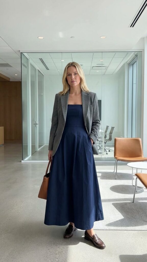 A relaxed fit maxi dress works beautifully when you add a tailored blazer and pointed-toe flats or low heels. Opt for solid colors or subtle floral print patterns that won’t overwhelm your professional image.
