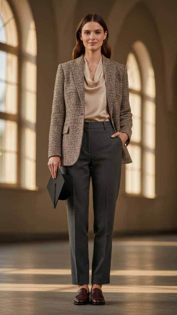 When you’re searching for graduation attire that exudes timeless sophistication, tweed jackets paired with straight-leg pants deliver unmatched elegance and versatility. This classic combination offers professional polish while maintaining your personal style freedom.