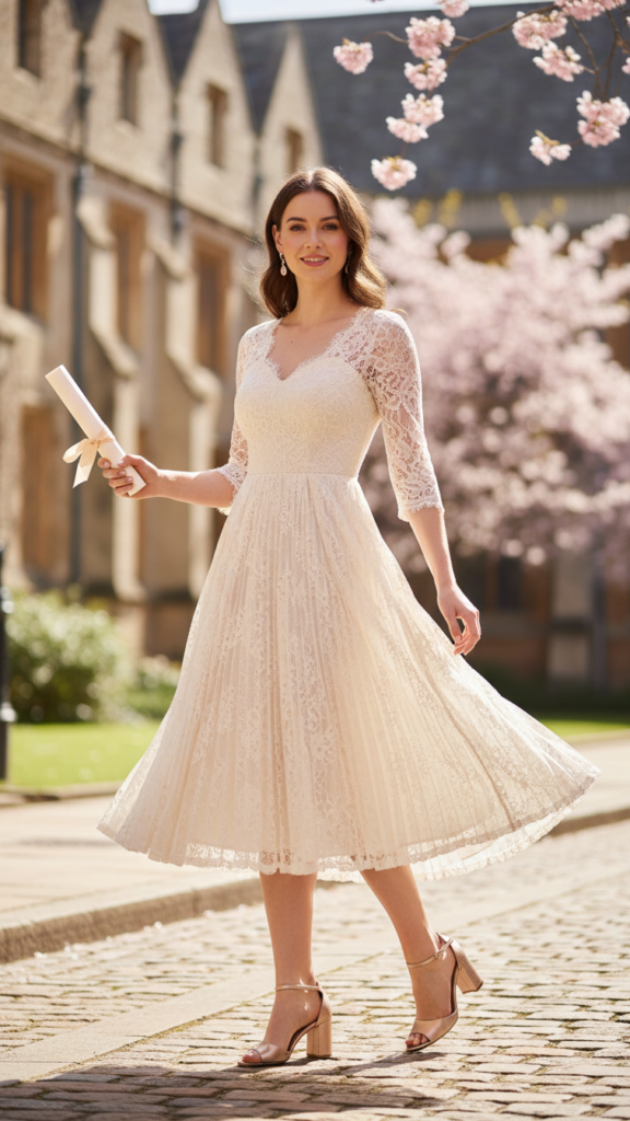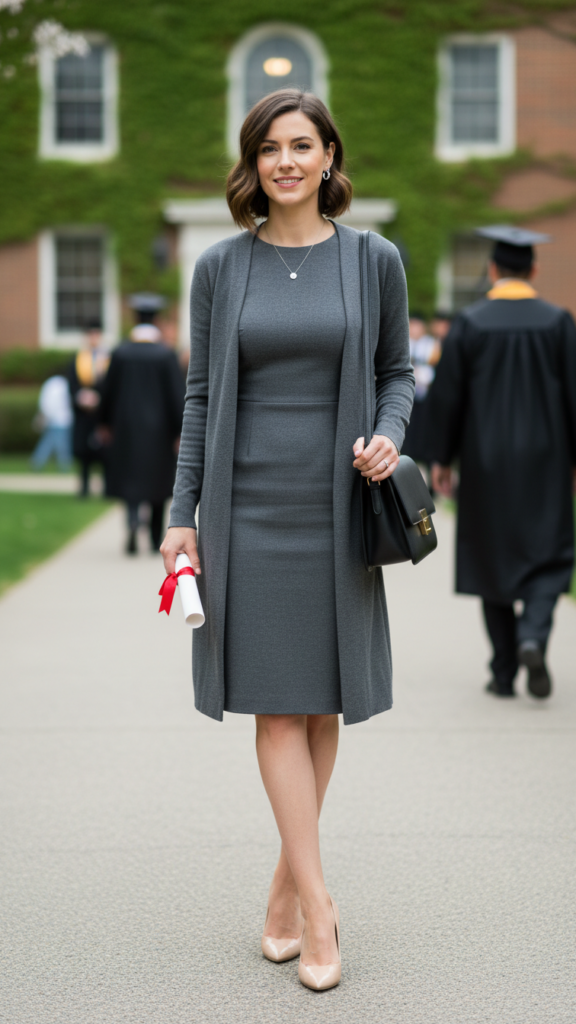 Complete this ensemble with pointed-toe flats or low heels, minimal jewelry, and a sleek clutch for a graduation outfit that celebrates your achievements with sophisticated style. This refined look ensures you’ll feel appropriately dressed for the formal ceremony while maintaining comfort during the lengthy proceedings.