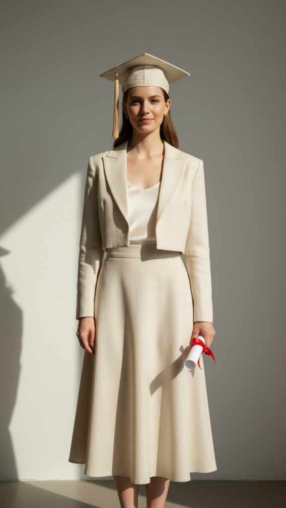 Professional sophistication meets modern style when you pair a cropped blazer with a high-waisted skirt for your graduation ceremony. This versatile combination offers endless styling possibilities while maintaining an polished appearance that’s perfect for celebrating your academic achievement.