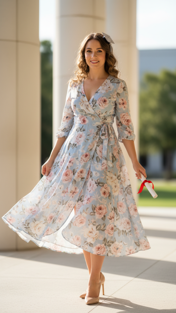A floral wrap dress offers the perfect balance between feminine elegance and effortless sophistication for your graduation day celebration. The flowing silhouette flatters every body type while creating graceful movement as you walk across the stage.