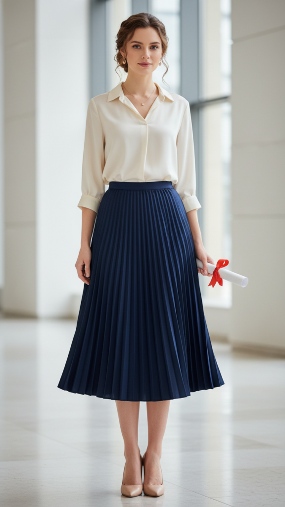 When you’re seeking feminine grace with sophisticated flair, pleated skirts paired with silk blouses deliver timeless charm that’s ideal for graduation day. Choose midi-length pleats in navy, burgundy, or classic black to create movement while maintaining formality.