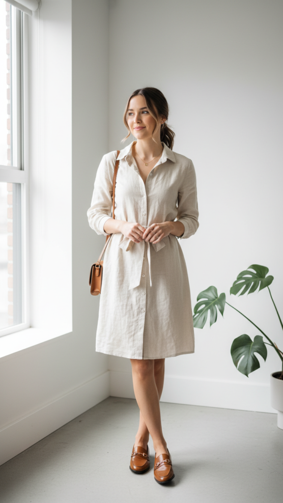 A shirt dress with belt and loafers offers an effortlessly chic alternative that combines the structured elegance of separates with the convenience of one cohesive piece. You’ll achieve a polished look while maintaining complete comfort throughout your ceremony.