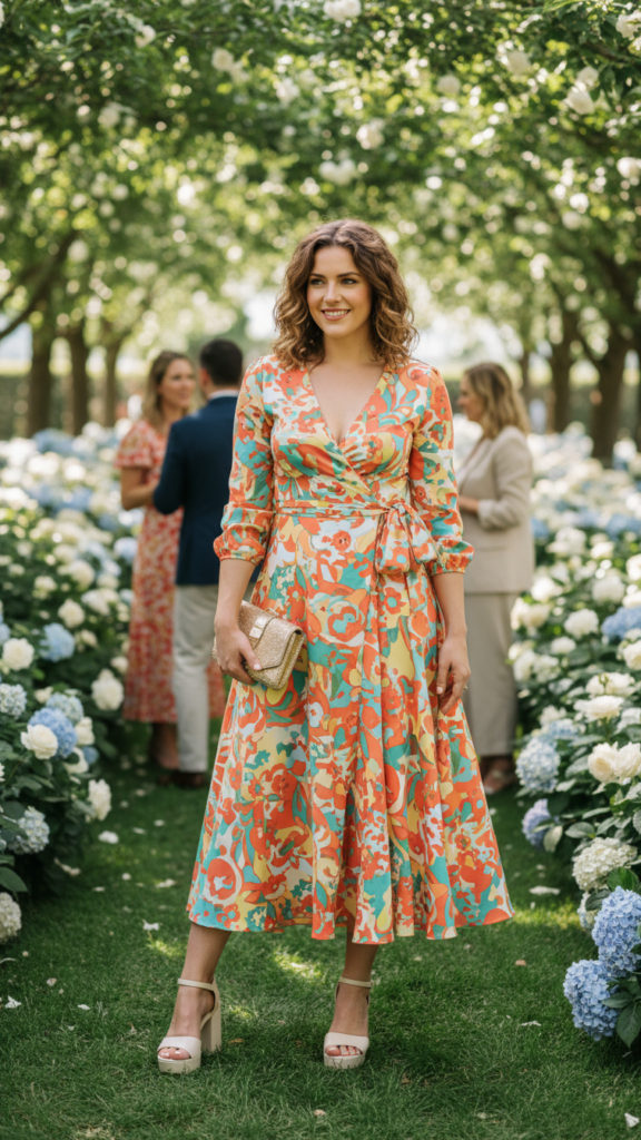 Wrap dresses are universally flattering and I will die on this hill. The silhouette works on literally every body type, and when you choose a playful print, you’ve got an engagement party look that stands out.