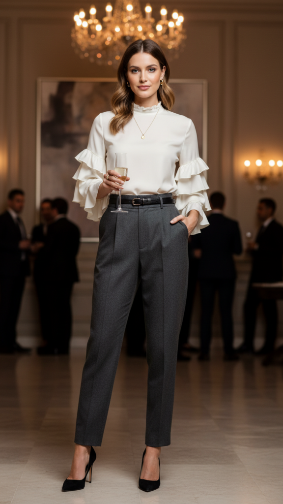 The trick is keeping the trousers fitted and high-waisted. Wide-leg works beautifully here, especially in a neutral like cream or black. Then let your top do all the talking with feminine details. A puff sleeve or subtle shimmer fabric takes this from “work meeting” to “celebrating love with champagne.”