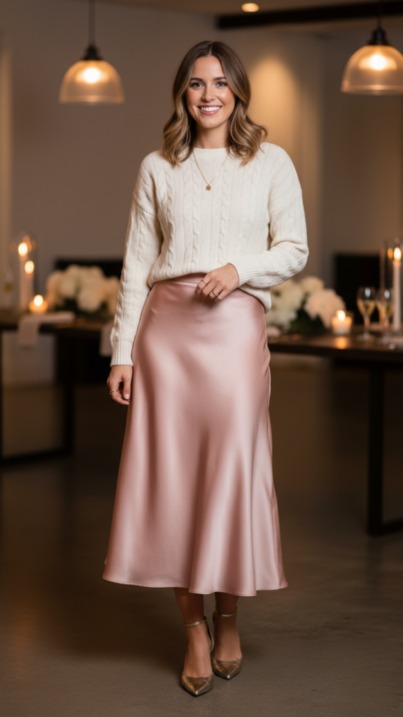 The texture contrast here is everything. Soft and shiny together just works. Go for a skirt in champagne, dusty rose, or classic black, and keep your knit simple. Tuck it in or do a French tuck if you’re feeling casual.