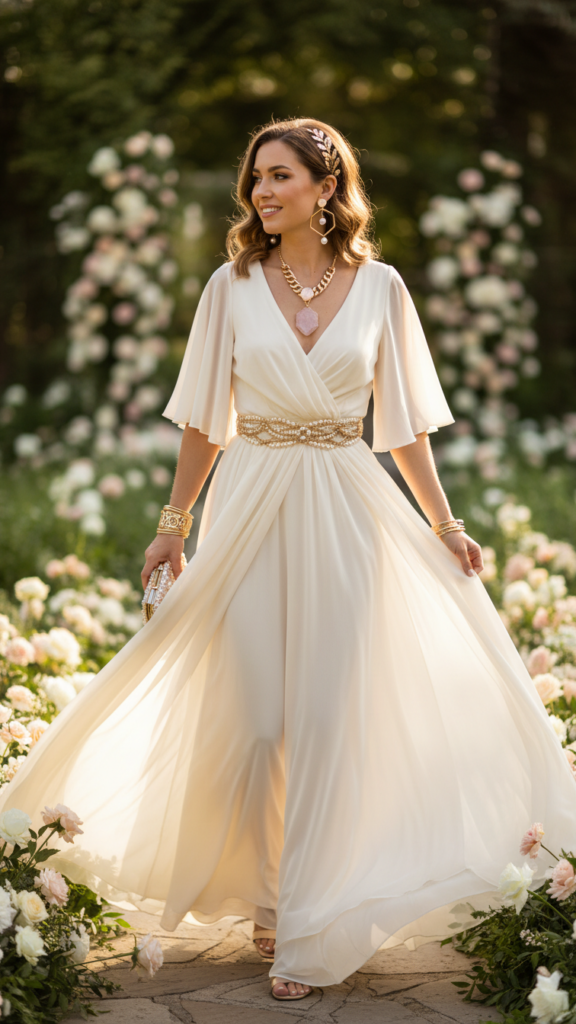 The secret weapon here is your accessories. A chunky gold cuff, layered necklaces, or dramatic earrings take this from “boho casual” to “engagement party ready.” Don’t skip a defined waist though, a thin belt or a style with a built-in tie keeps the silhouette flattering.