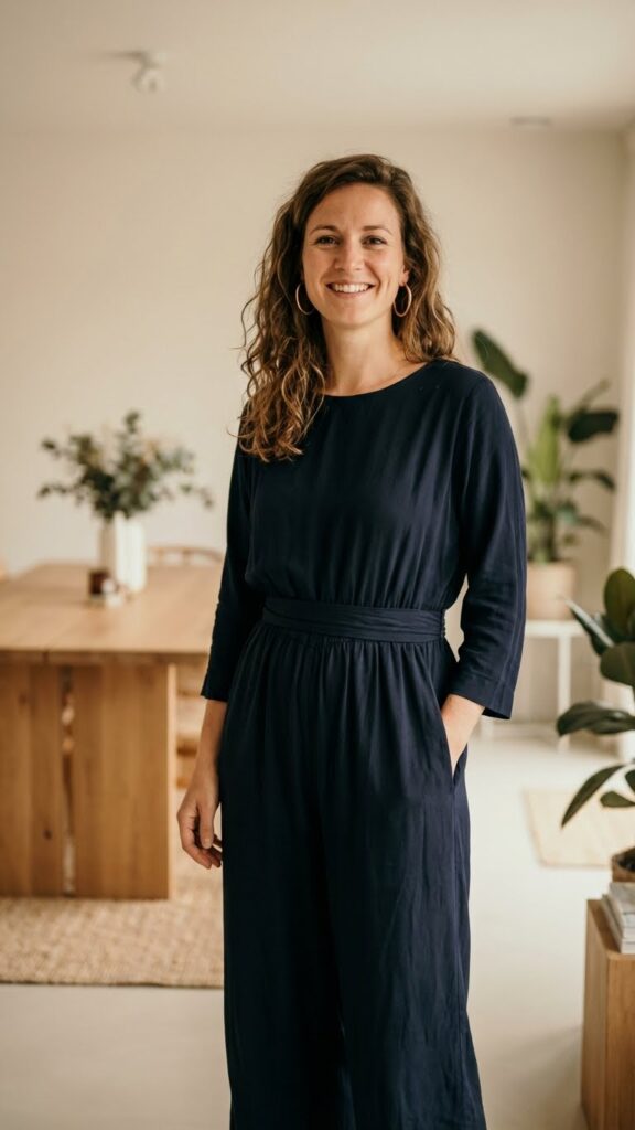 For family dinners, look for a jumpsuit in a drapey fabric with a relaxed fit through the legs. Tailored details like a defined waist or interesting neckline keep it from looking too casual. Dark colors like navy, black, or olive photograph beautifully and hide any sauce emergencies.