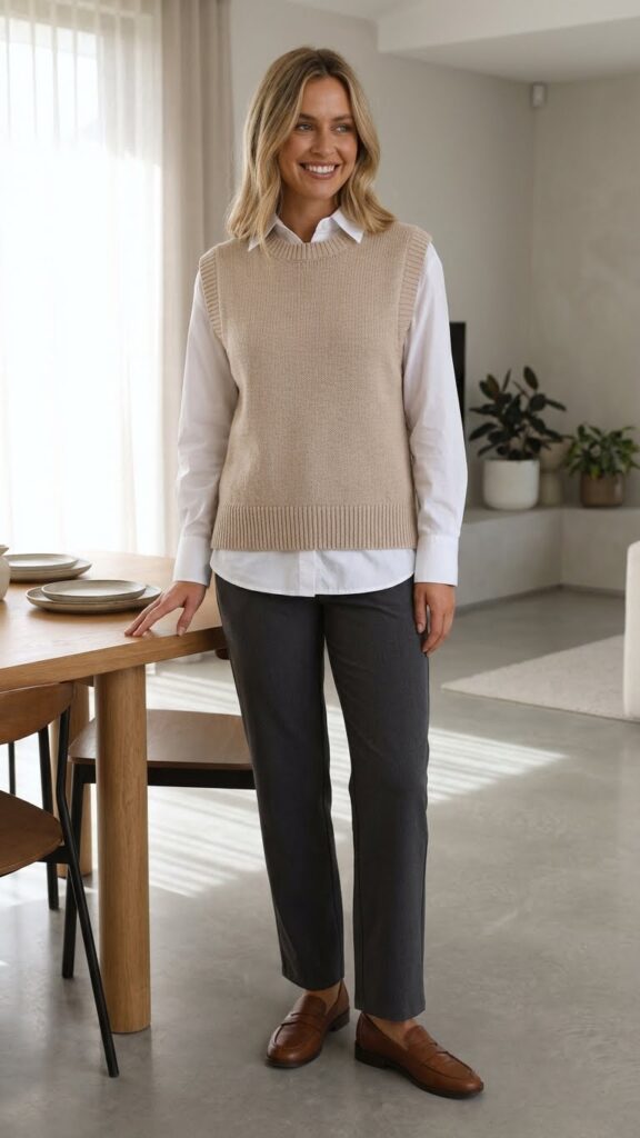 The sweater vest is having a serious moment, and I’m not mad about it. Layered over a classic button-down, it gives very preppy-cool without trying too hard.