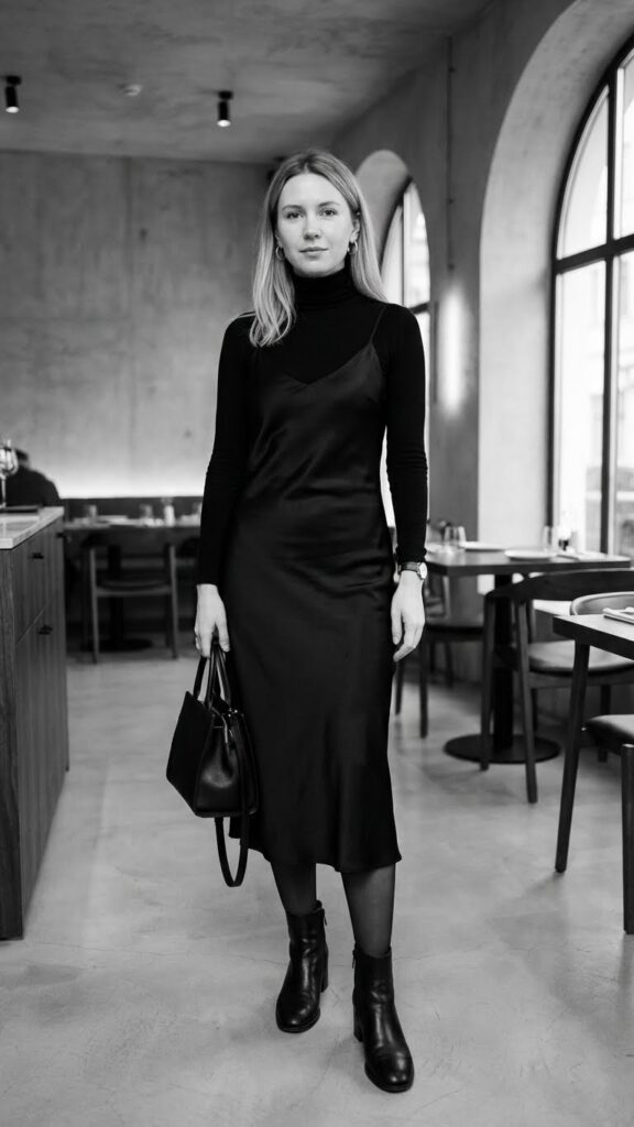 Hear me out. This combo sounds like fashion Pinterest gone wrong, but executed correctly? Stunning. A satin or silk slip dress over a fitted turtleneck gives you coverage, warmth, and an outfit that looks like you have a personal stylist on retainer.