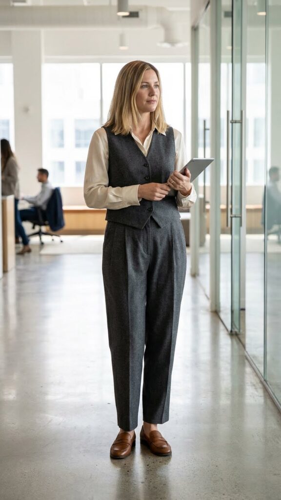 Vests are back, and honestly, they never should have left. A tailored vest worn over a simple long-sleeve shirt with matching or coordinating trousers gives you that pulled-together suiting vibe without the full blazer commitment.