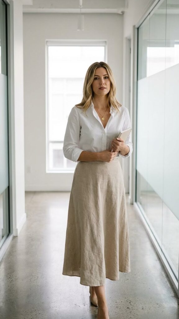 Is there anything more timeless than a crisp white shirt? Tuck it into a flowy midi skirt and suddenly you’re giving main character energy without even trying. The contrast between the structured top and softer bottom creates this beautiful balance that’s professional but not boring.