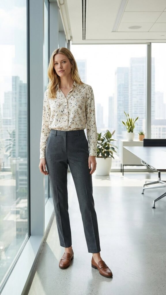 Keep the pants neutral so the top can shine. And please, tuck in that blouse. A half-tuck situation works too if you’re feeling more relaxed. This look says “I’m professional AND interesting”—which, let’s be honest, is the vibe we’re all going for.