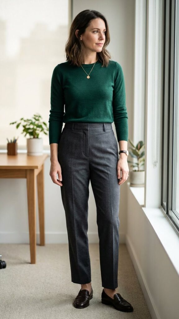 The key is keeping the sweater fitted rather than chunky. You want polished, not “I’m ready for my couch.” Add a leather belt and some structured earrings, and you’ve nailed that smart-casual first day look.
