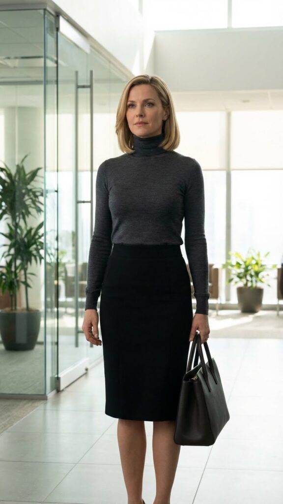 This combo is giving “I read Vogue and also your quarterly reports.” A slim turtleneck tucked into a pencil skirt creates this gorgeous streamlined silhouette that works in basically any office setting.