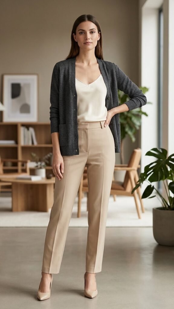 Layers are your friend, especially when you have no idea if your new office runs hot or cold. A structured cardigan worn over a silky camisole with tailored trousers gives you options AND style points.