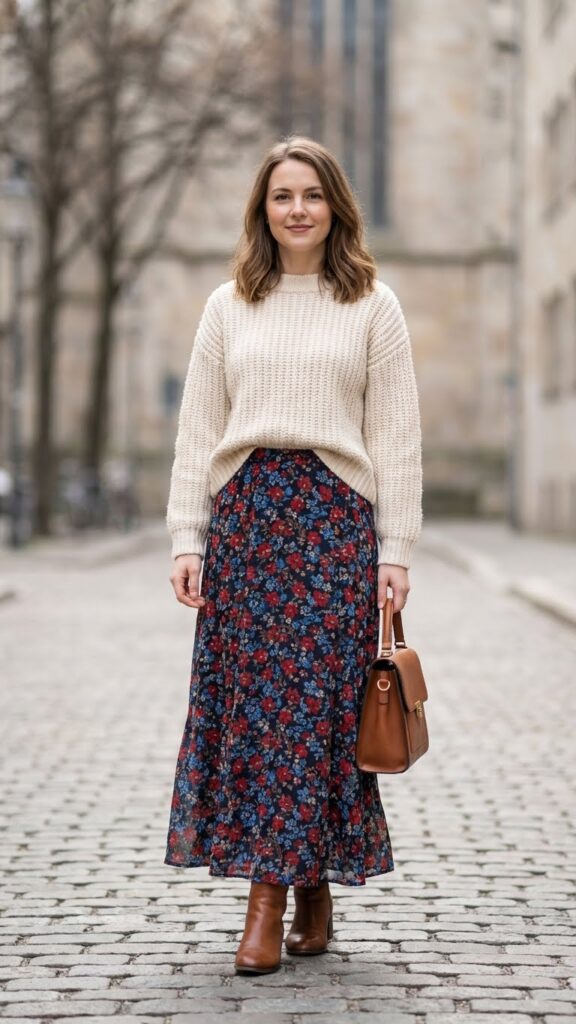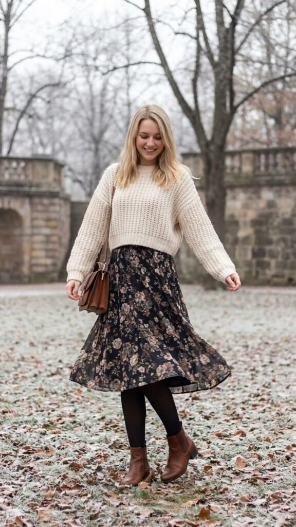 When temperatures drop, pairing a cashmere crewneck with knee-high boots creates a polished foundation for your floral skirt ensemble. This combination balances feminine prints with cozy textures that keep you warm without sacrificing style.