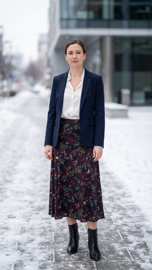 The key to nailing this combination lies in color coordination. Pull a subtle shade from your skirt’s floral pattern and match it to your blazer. Navy, burgundy, and forest green blazers complement dark florals beautifully while maintaining winter-appropriate depth. Chic cold-weather styling can be achieved with this pairing.
