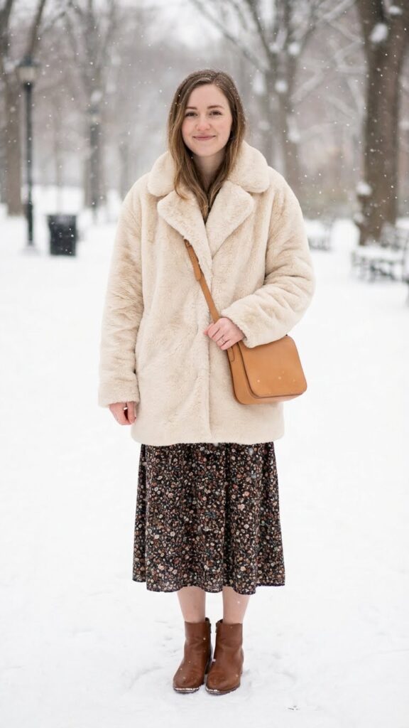 For an even bolder statement, swap your structured blazer for a luxurious faux fur coat and let a vintage floral skirt take center stage. This combination delivers cozy warmth while celebrating your individual style without compromise.