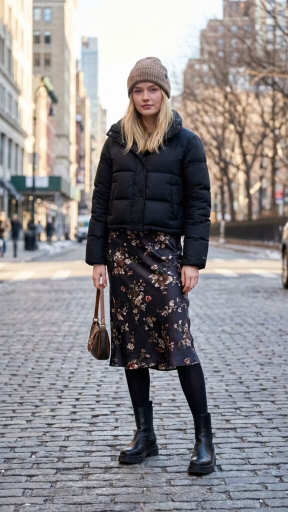 The satin fabric texture of your floral midi skirt catches light beautifully, offering a graceful counterpoint to your cozy outerwear. Choose a cropped puffer in a solid color that pulls from your skirt’s floral print for a cohesive look.