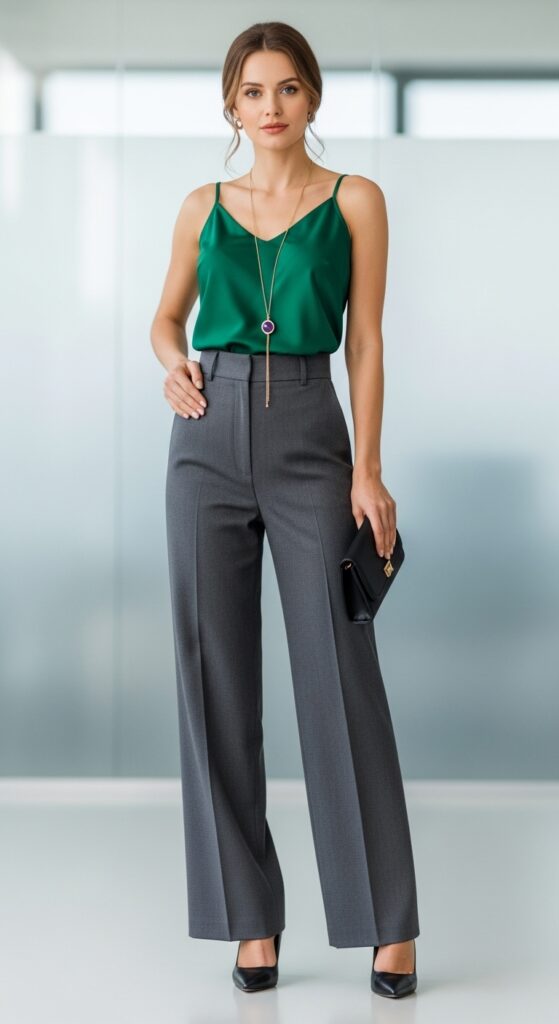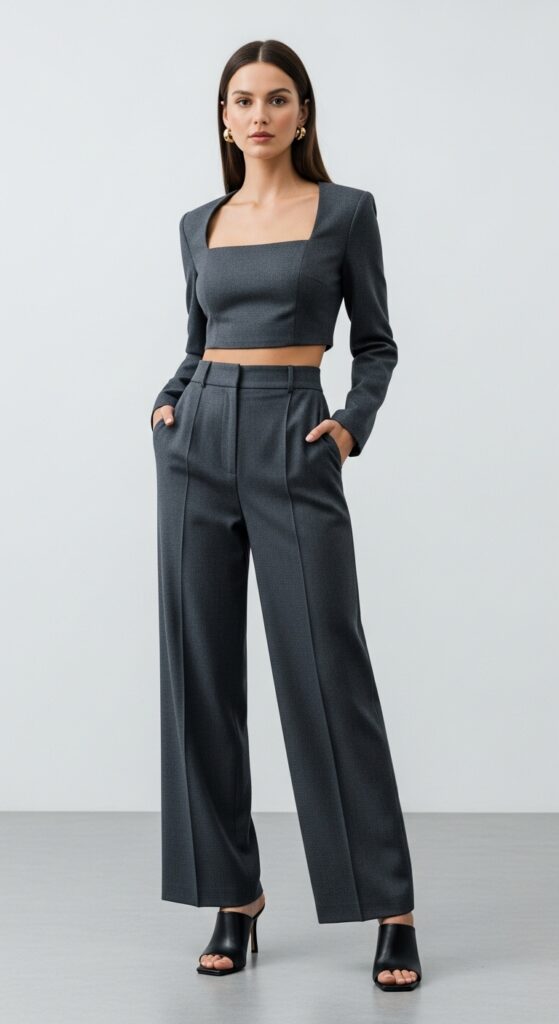 This combo is especially flattering if you love wide-leg formal trousers because the proportions are just chef’s kiss. The slightly cropped top defines your waist while the wide-leg trousers elongate your legs. Add heeled sandals or mules and suddenly you’ve got an outfit that feels fresh and modern without breaking any dress codes.
